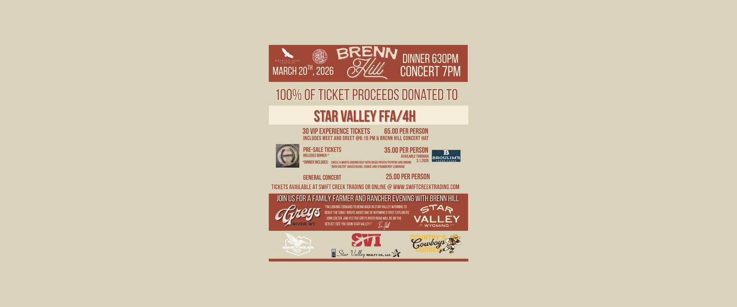 Swift Creek Trading and Western Skies Fine Arts presents 2026 Star Valley Farmers and Ranchers Benefit Concert with Brenn Hill