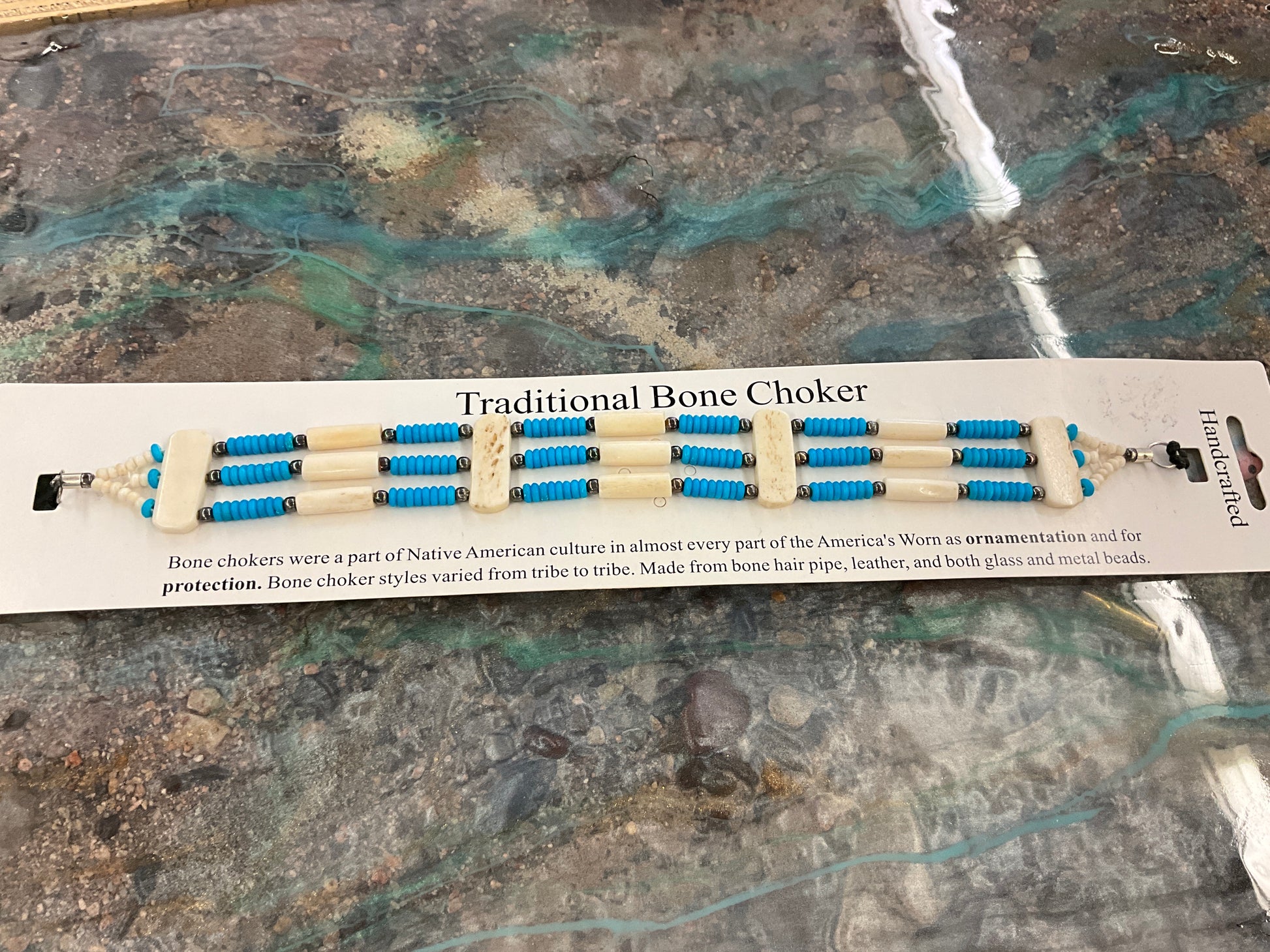 HANDCRAFTED BONE CHOKER-MADE FROM BONE HAIR PIPE-LEATHER AND BOTH GLASS AND METAL BEADS