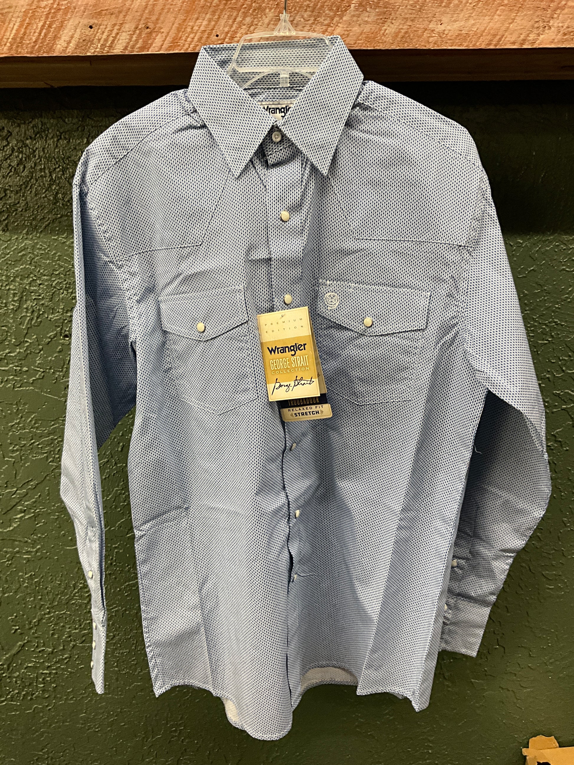6/25- Wrangler MENS blue plaid print snap button up long sleeve dress shirt, snap button close cuff, right and left chest pockets
