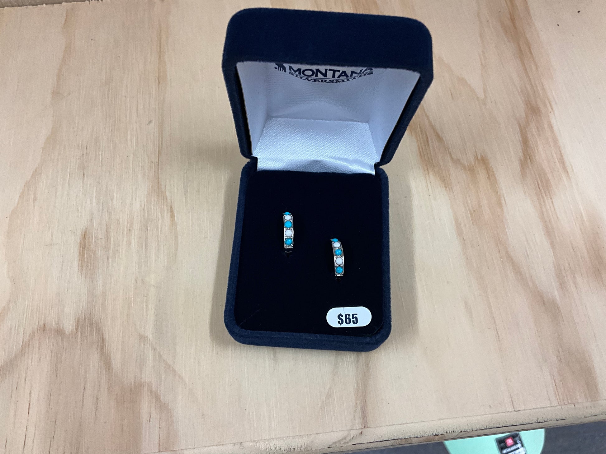Earrings are turq and white stones dangling down hoops