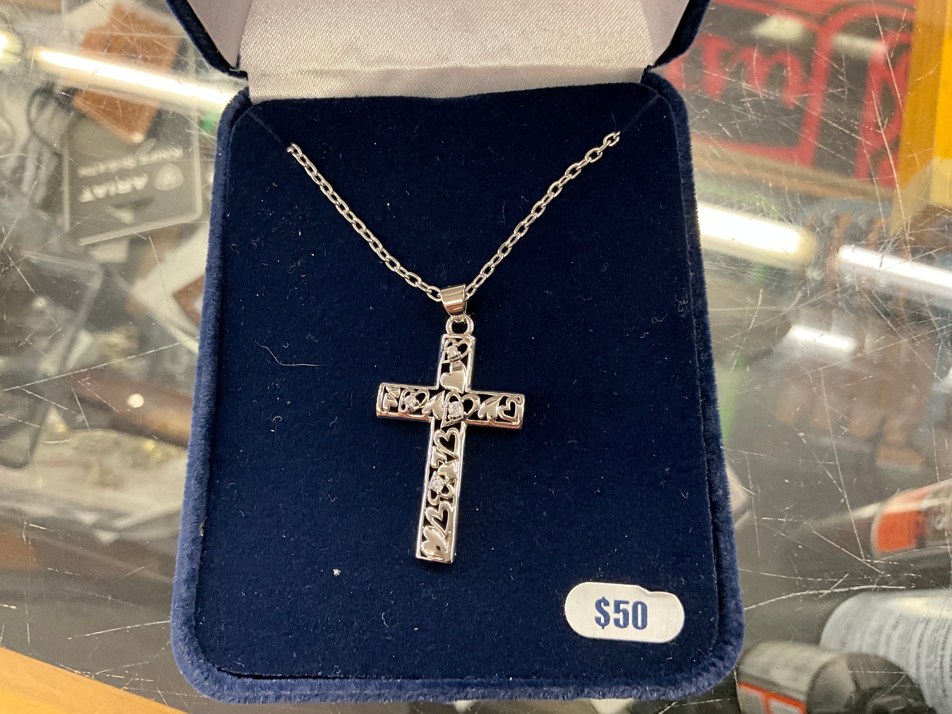 11/24- silver cross pendant filled with filagree hearts, 18.5” silver tone chain