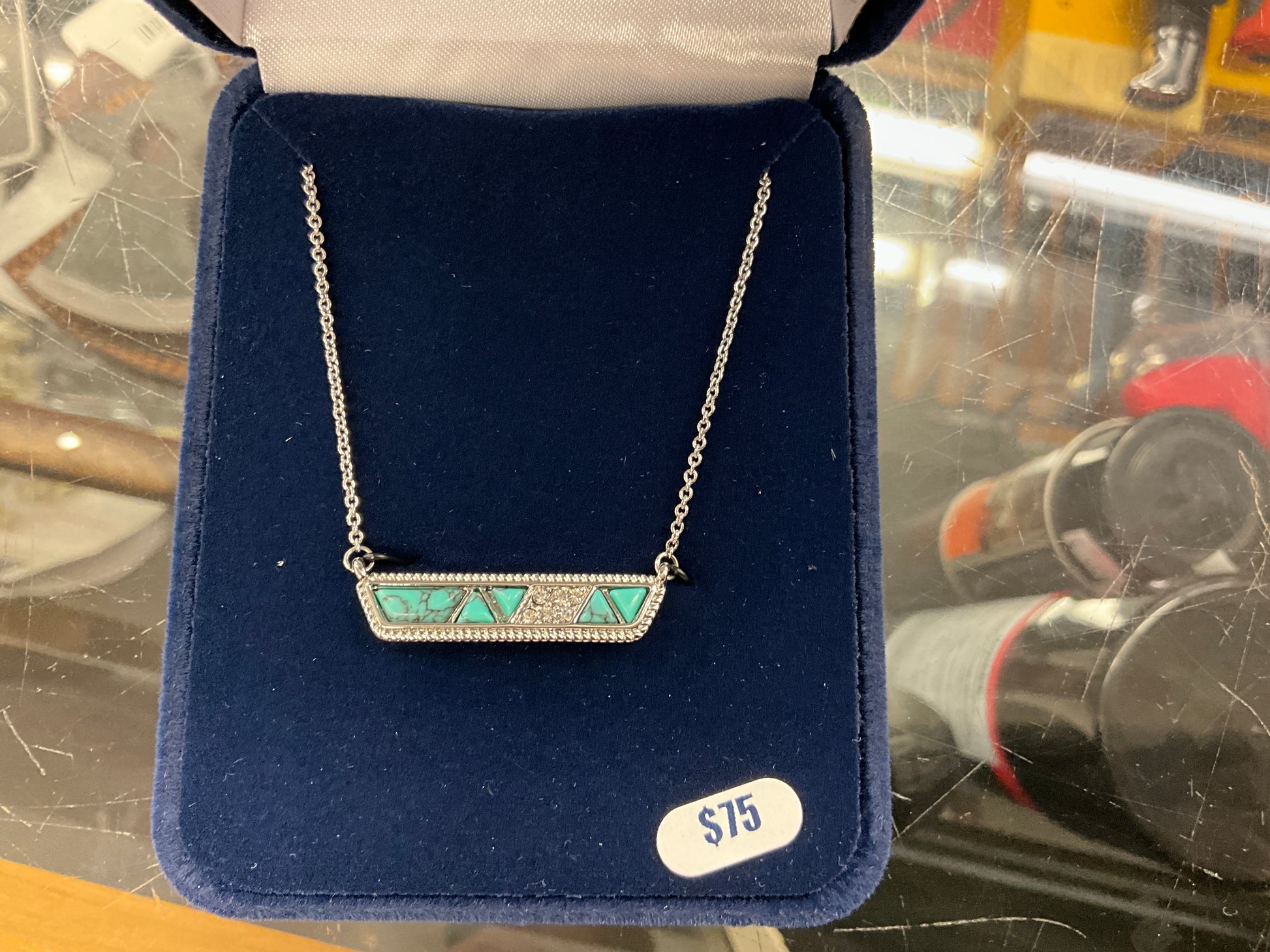 1/25- bar necklace w/cobblestone turq, zirconia section, 19” chain