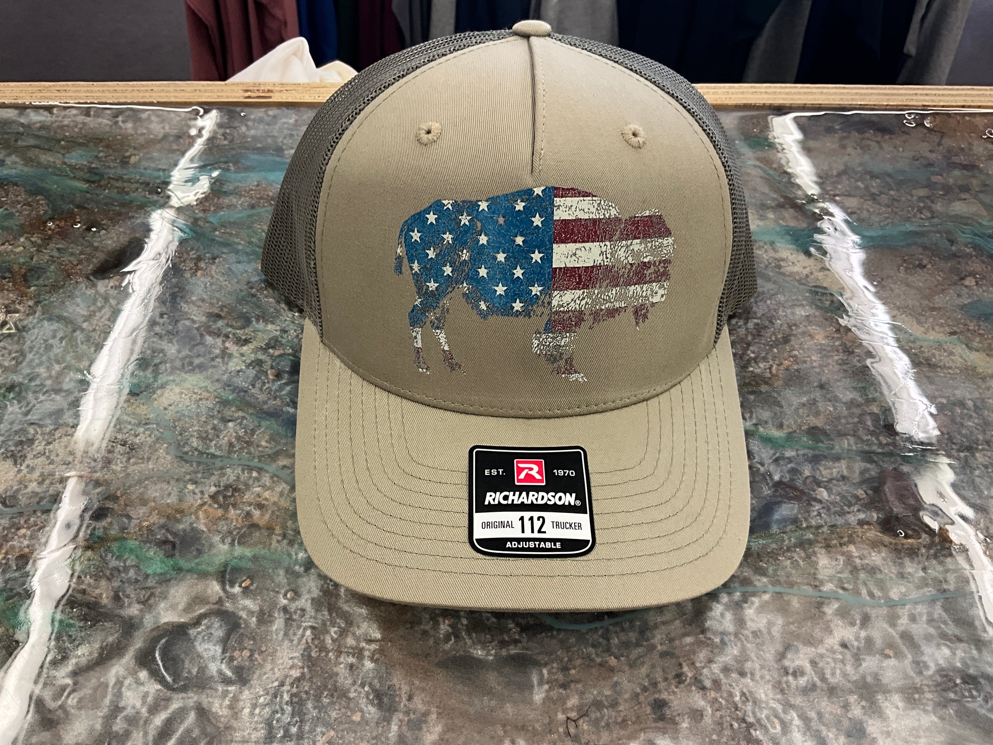 SWIFTWEAR custom hat of a Wyoming flag colored bison, flat print or leather patch version
