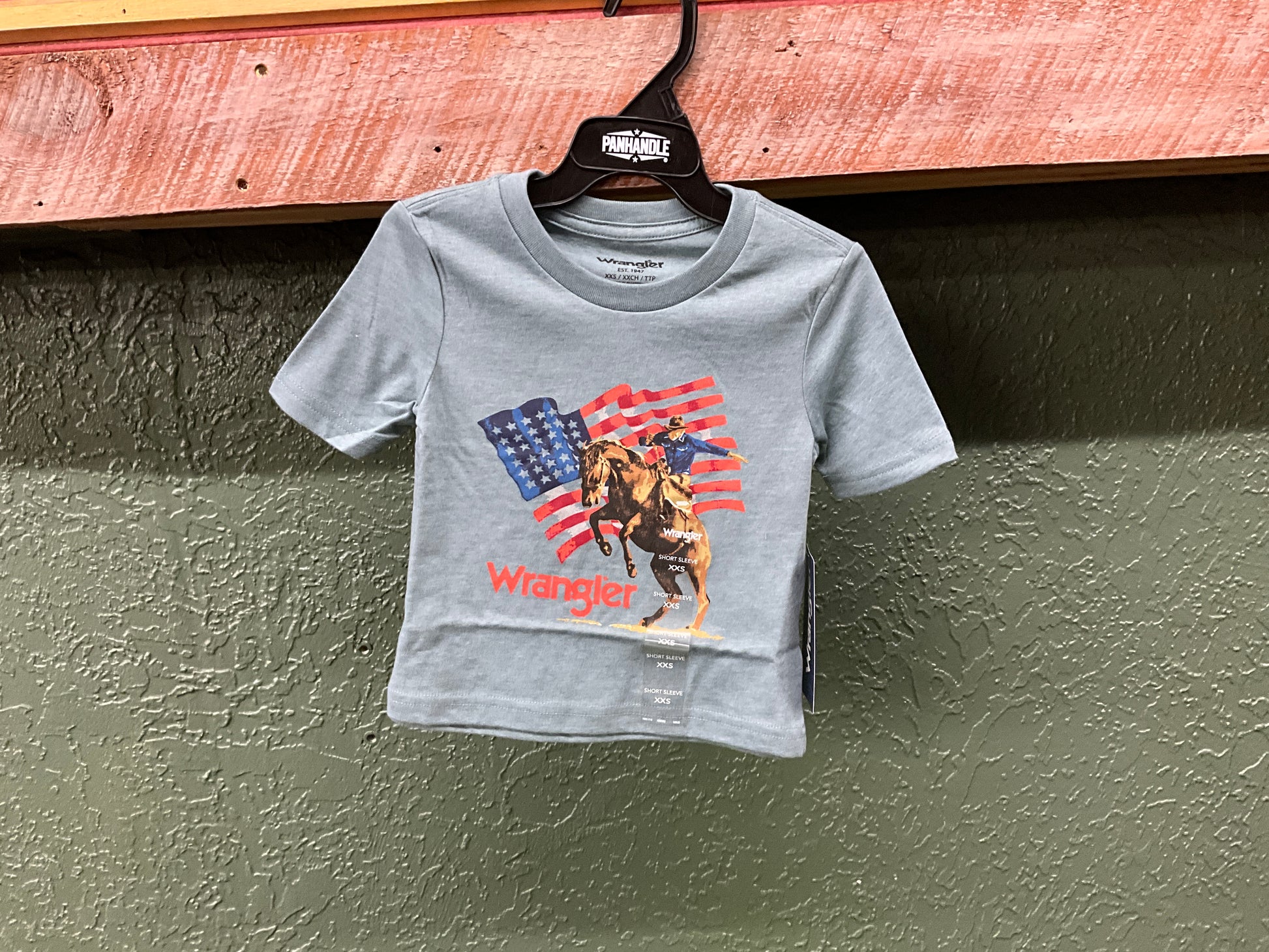 6/25- cotton/poly blend short sleeve tee, bronc/flag front graphic