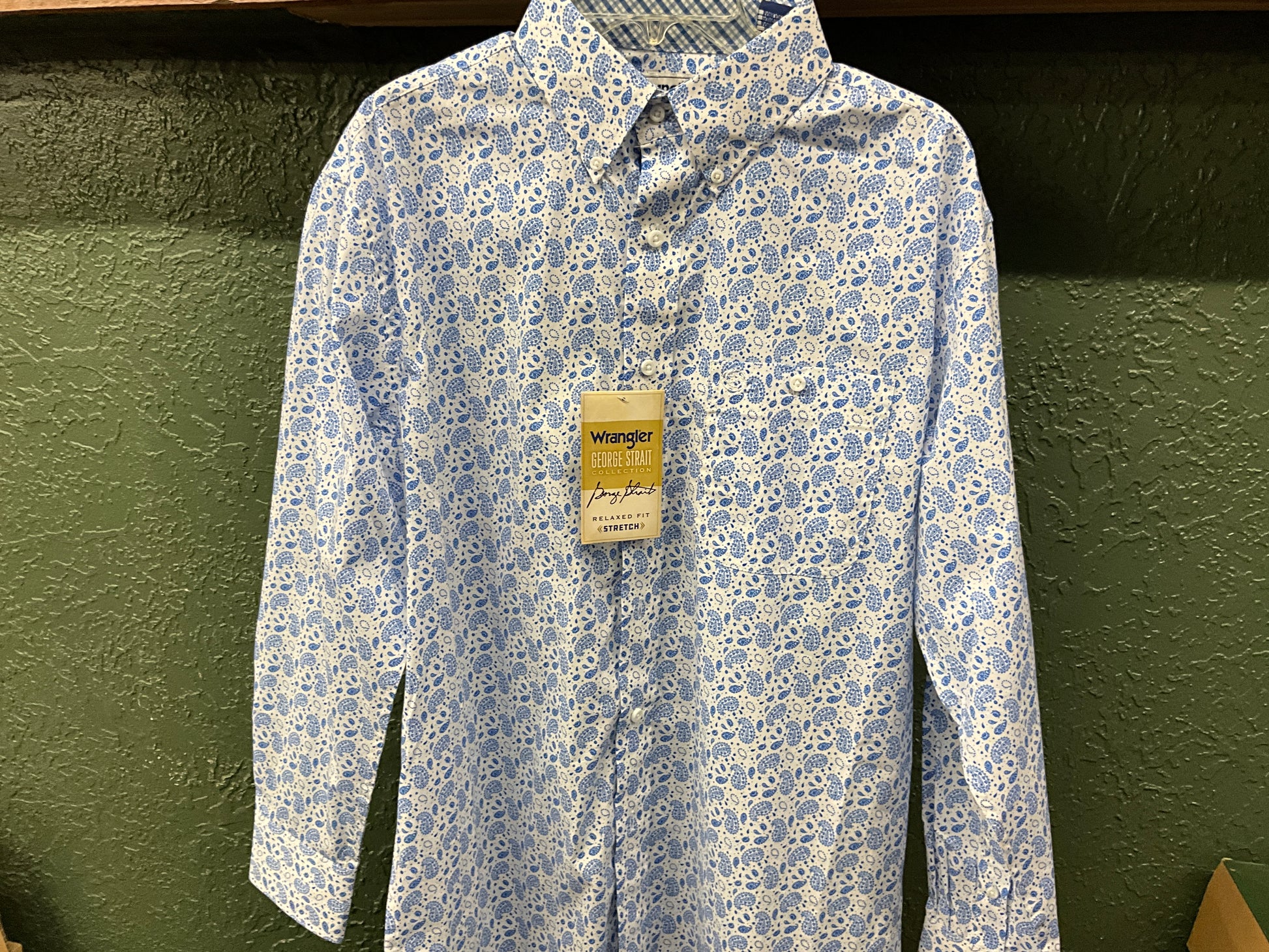 George Strait shirt is cotton/spandex blend, long sleeve button, left chest pocket