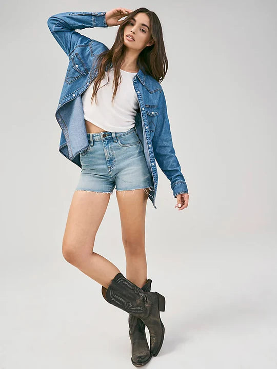 Flattering in every way, the Women’s Wrangler Retro® Bailey High Rise Cut Off Shorts will show you off just as they should. They’re crafted from a soft cotton blend with just a hint of stretch for extra comfort. These slim cutoffs also come fully loaded with our signature “W” pocket stitching, a branded patch, a 3” inseam, and a raw hem for just the right amount of distressing.